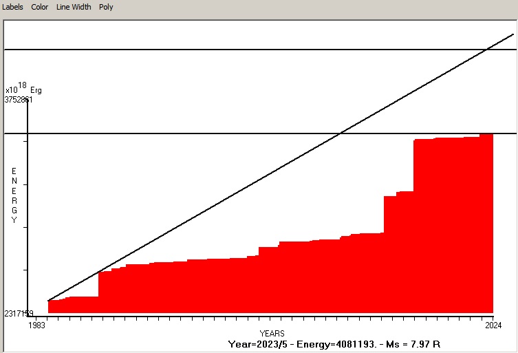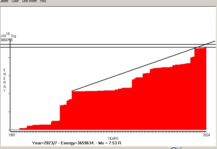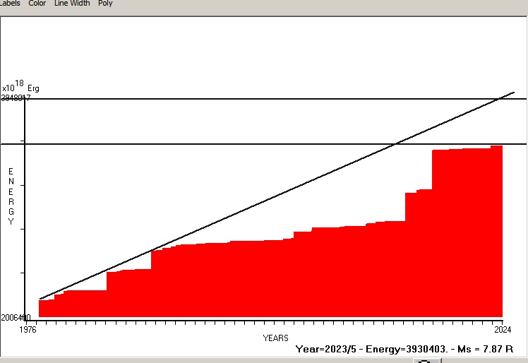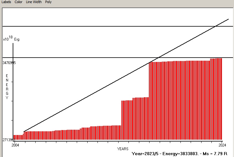 Fig. 8. Expected EQ magnitude due to application of the LSEFM (Lithospheric Seismic Energy Flow Model) on past (since 2004) seismic history of the regional seismogenic area. Contact us at : gthanding@gmail.com
