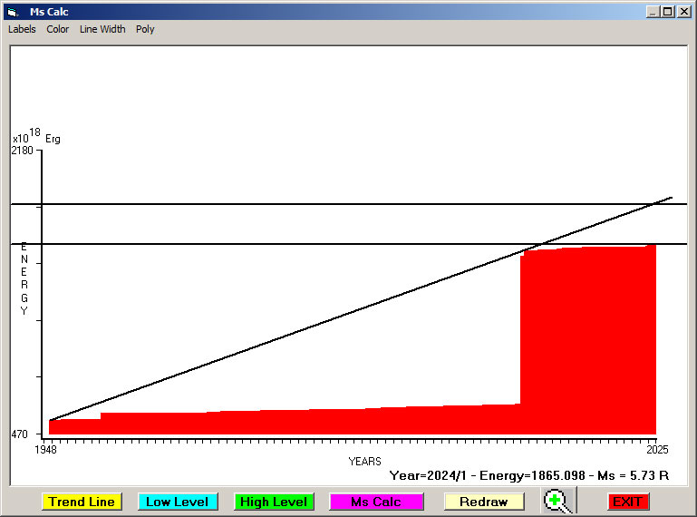 Fig. 6. Expected EQ magnitude due to application of the LSEFM (Lithospheric Seismic Energy Flow Model) on past (since 1948) seismic history of the regional seismogenic area.