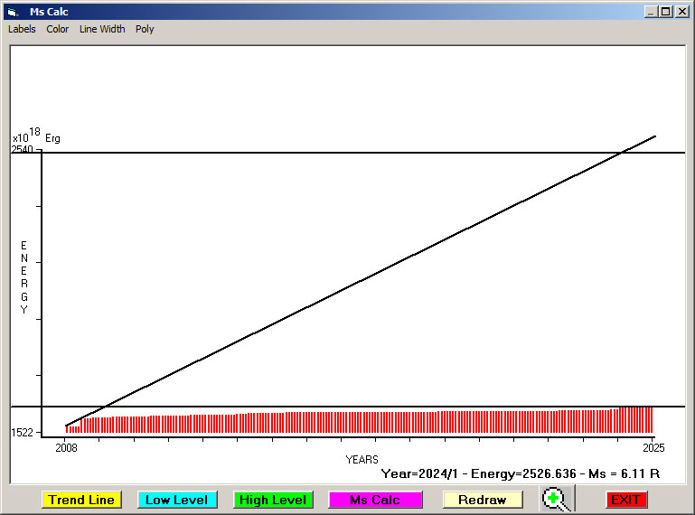 Fig. 7. Expected EQ magnitude due to application of the LSEFM (Lithospheric Seismic Energy Flow Model) on past (since 2008) seismic history of the regional seismogenic area.