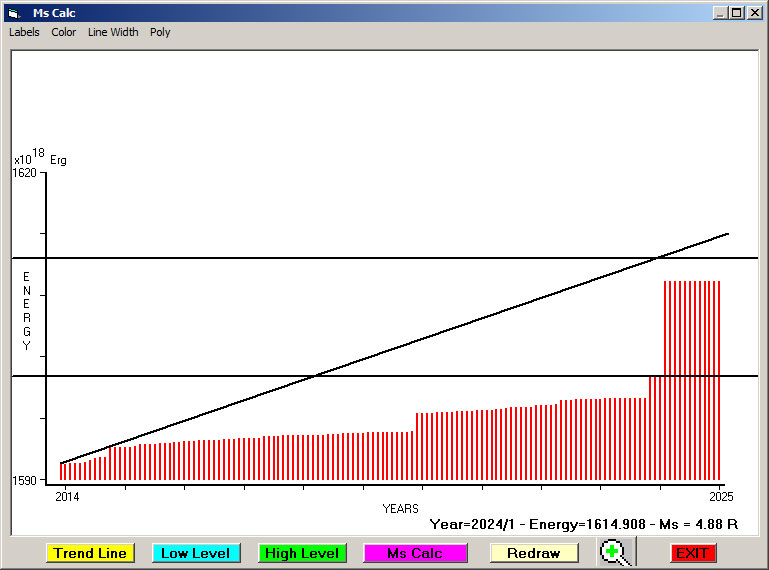 Fig. 9. Expected EQ magnitude due to application of the LSEFM (Lithospheric Seismic Energy Flow Model) on past (since 2012) seismic history of the regional seismogenic area.