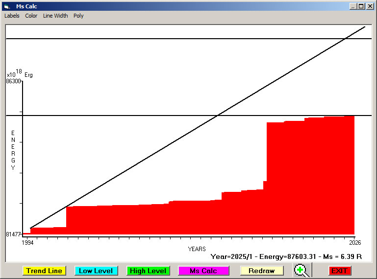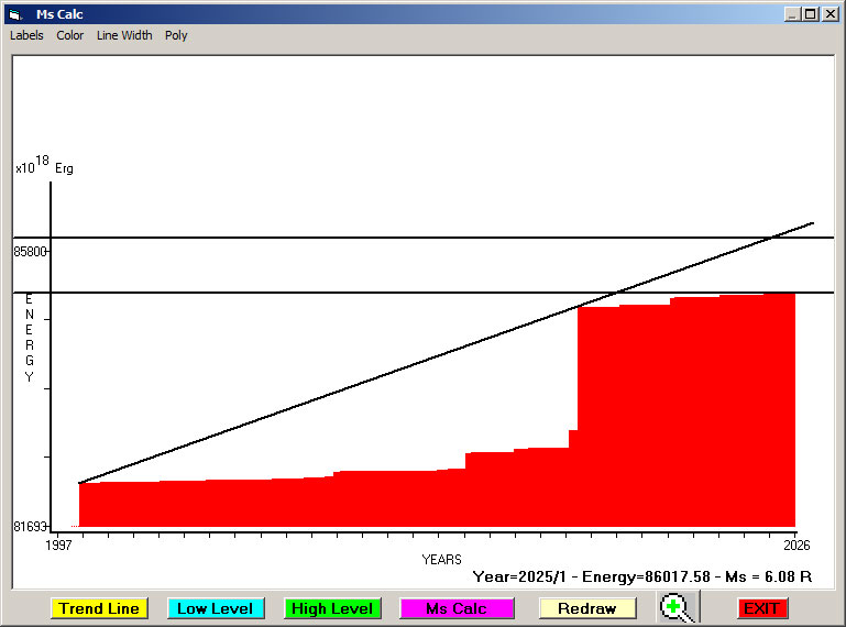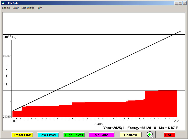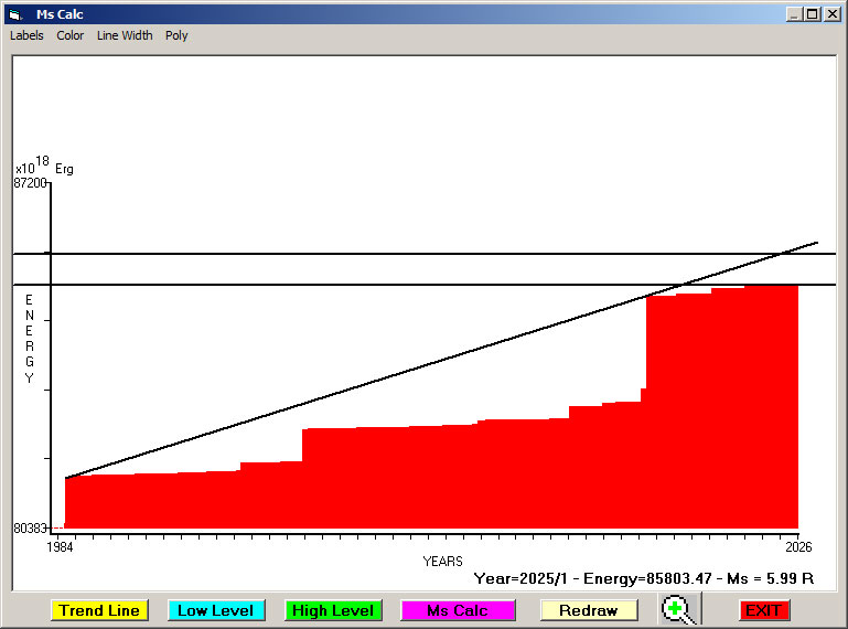 Fig. 7. Expected EQ magnitude due to application of the LSEFM (Lithospheric Seismic Energy Flow Model) on past (since 1984) seismic history of the regional seismogenic area.