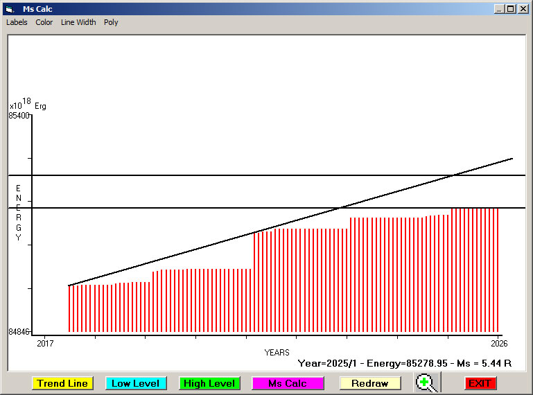 Fig. 12. Expected EQ magnitude due to application of the LSEFM (Lithospheric Seismic Energy Flow Model) on past (since 2021) seismic history of the regional seismogenic area.