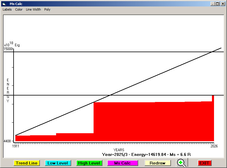 Fig. 5. Expected EQ magnitude due to application of the LSEFM (Lithospheric Seismic Energy Flow Model) on past (since 1911) seismic history of the regional seismogenic area (Outer radius = 20 Km).