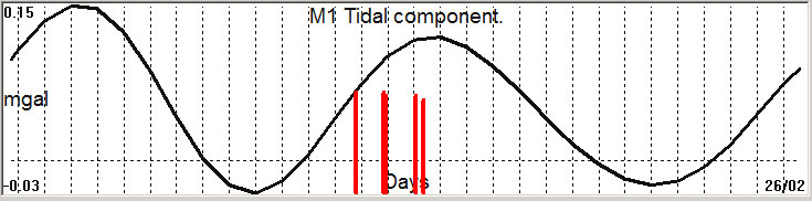 Fig. 2. M1 tidal variation (black line) v.s time of occurrence (red bar) of the EQ.