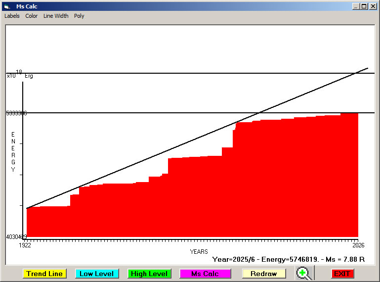 Fig. 6. Expected EQ magnitude due to application of the LSEFM (Lithospheric Seismic Energy Flow Model) on past (since 1936) seismic history of the regional seismogenic area.