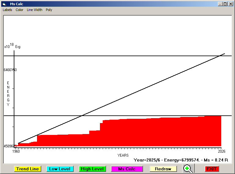 Fig. 7. Expected EQ magnitude due to application of the LSEFM (Lithospheric Seismic Energy Flow Model) on past (since 1960) seismic history of the regional seismogenic area.