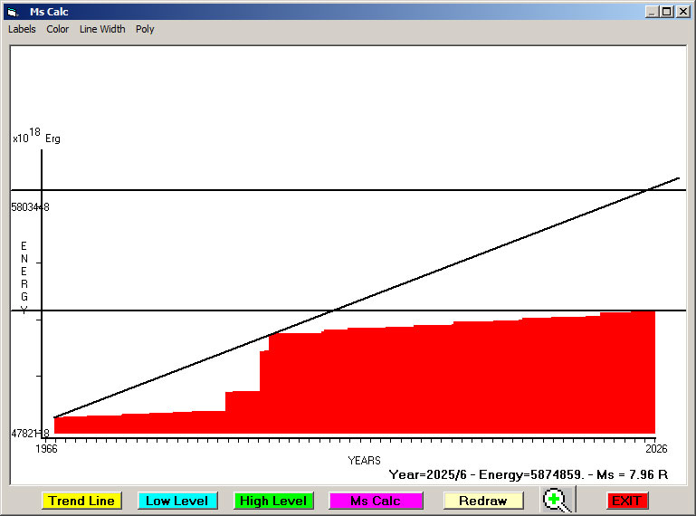 Fig. 8. Expected EQ magnitude due to application of the LSEFM (Lithospheric Seismic Energy Flow Model) on past (since 1966) seismic history of the regional seismogenic area.