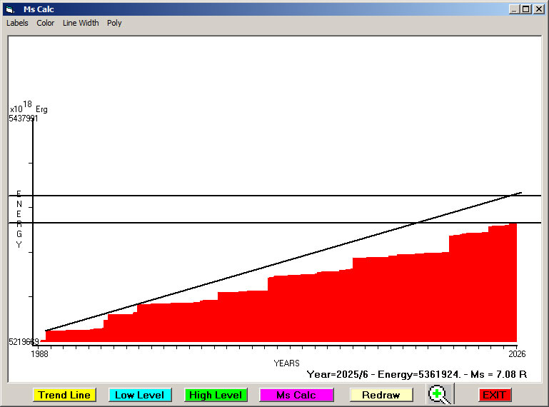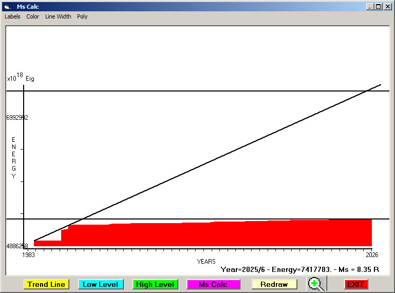 Fig. 9. Expected EQ magnitude due to application of the LSEFM (Lithospheric Seismic Energy Flow Model) on past (since 1983) seismic history of the regional seismogenic area.