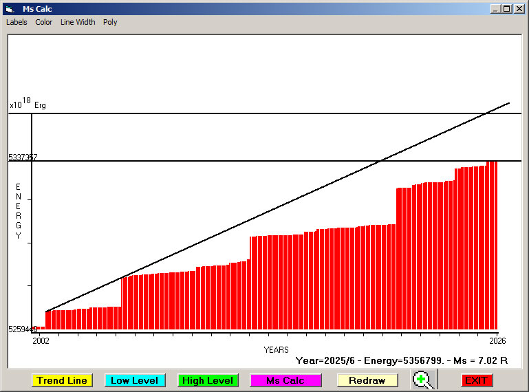 Fig. 11. Expected EQ magnitude due to application of the LSEFM (Lithospheric Seismic Energy Flow Model) on past (since 2002) seismic history of the regional seismogenic area.