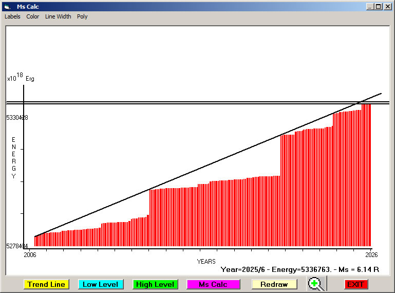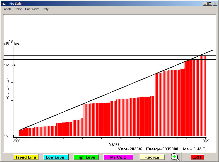 Fig. 12. Expected EQ magnitude due to application of the LSEFM (Lithospheric Seismic Energy Flow Model) on past (since 2006) seismic history of the regional seismogenic area.