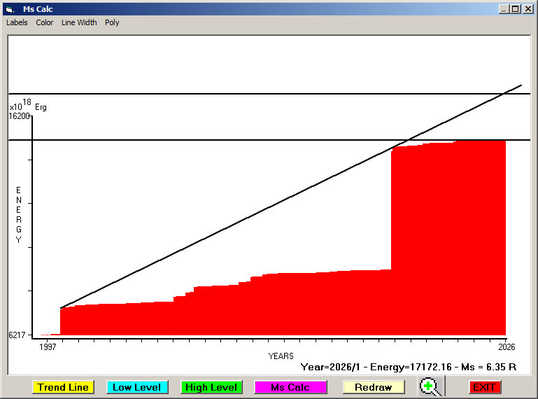 Fig. 7. Expected EQ magnitude due to application of the LSEFM (Lithospheric Seismic Energy Flow Model) on past (since 1983) seismic history of the regional seismogenic area.