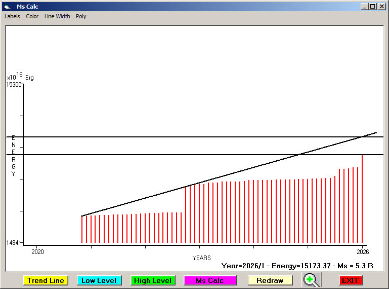 Fig. 11. Expected EQ magnitude due to application of the LSEFM (Lithospheric Seismic Energy Flow Model) on past (since 2022) seismic history of the regional seismogenic area.