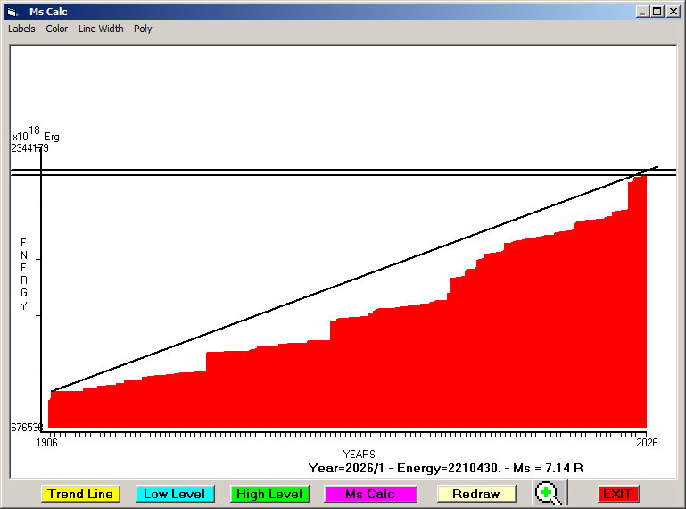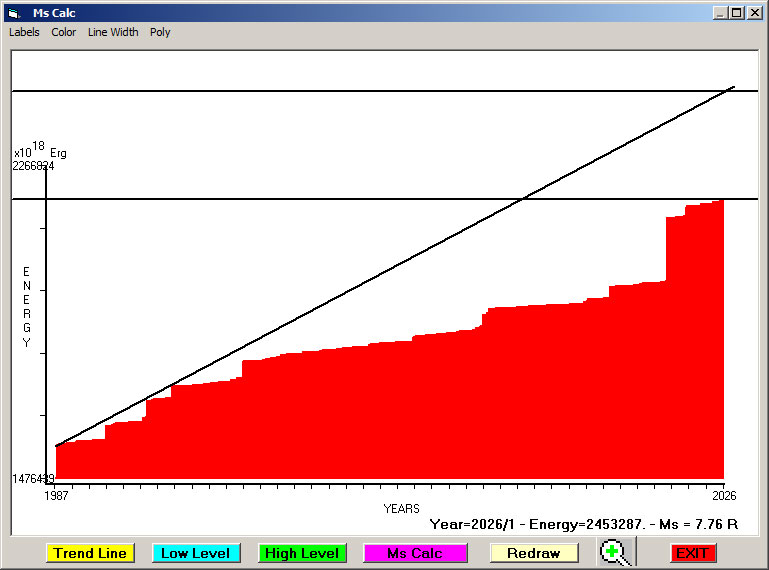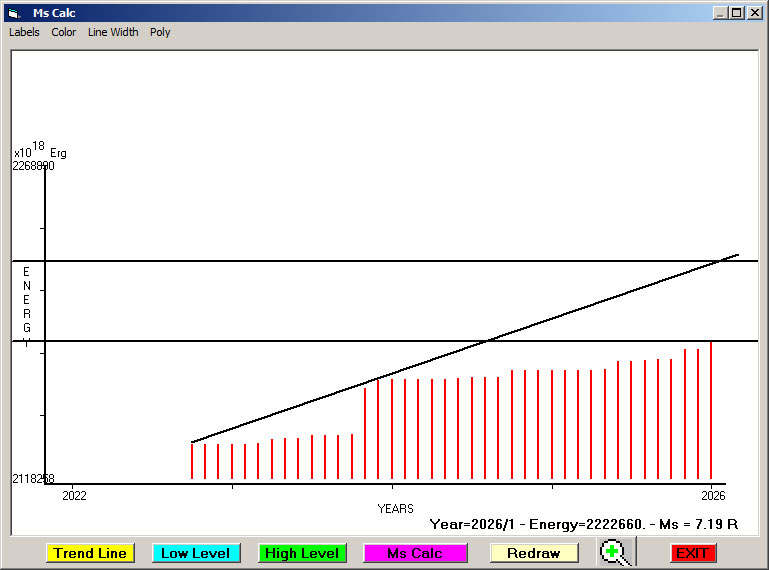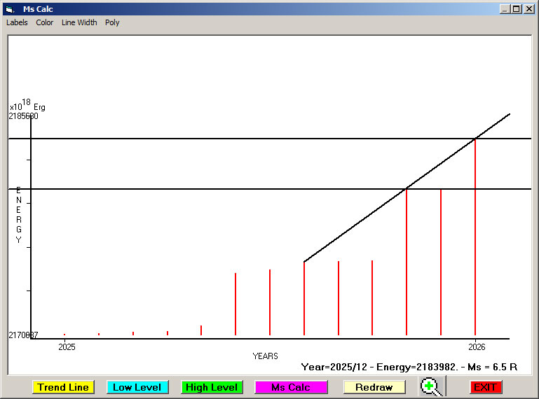 Fig. 8. Expected EQ magnitude due to application of the LSEFM (Lithospheric Seismic Energy Flow Model) on past (since 2025) seismic history of the regional seismogenic area.