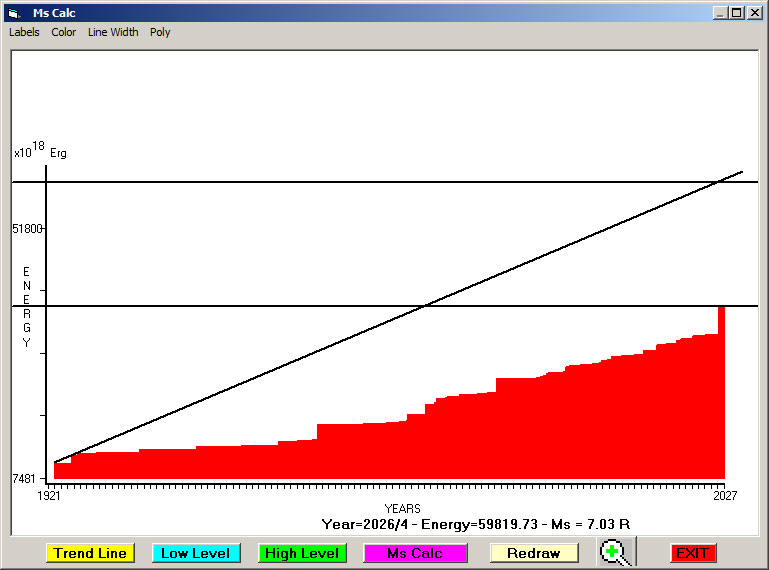 Fig. 5. Expected EQ magnitude due to application of the LSEFM (Lithospheric Seismic Energy Flow Model) on past (since 1921) seismic history of the regional seismogenic area.