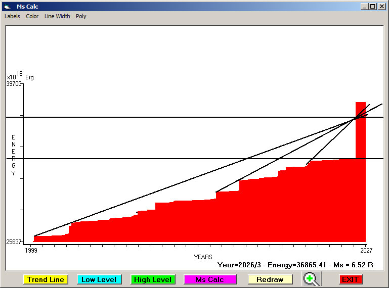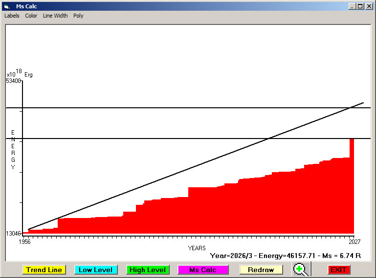 Fig. 6. Expected EQ magnitude due to application of the LSEFM (Lithospheric Seismic Energy Flow Model) on past (since 1956) seismic history of the regional seismogenic area.