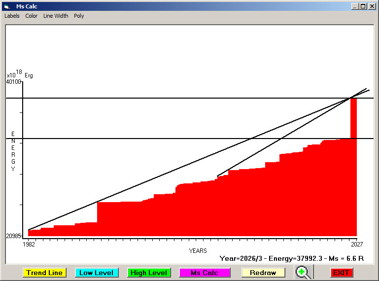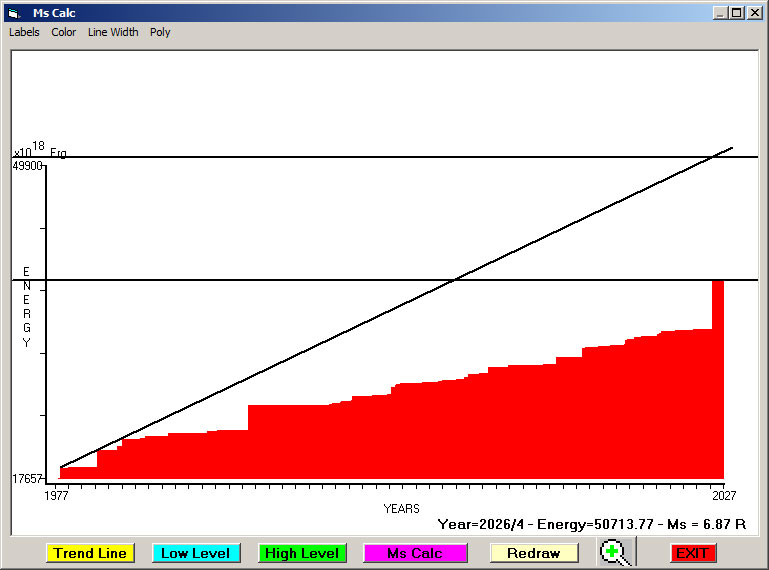 Fig. 8. Expected EQ magnitude due to application of the LSEFM (Lithospheric Seismic Energy Flow Model) on past (since 1977) seismic history of the regional seismogenic area.