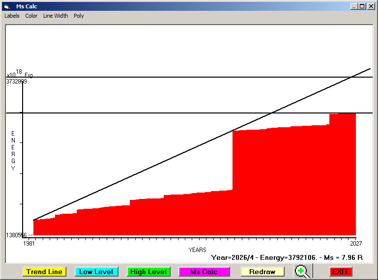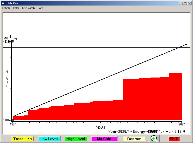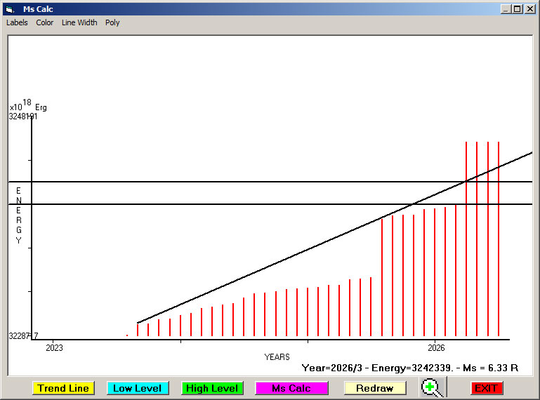 Fig. 9. Expected EQ magnitude due to application of the LSEFM (Lithospheric Seismic Energy Flow Model) on past (since 2023) seismic history of the regional seismogenic area.