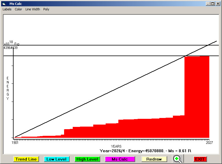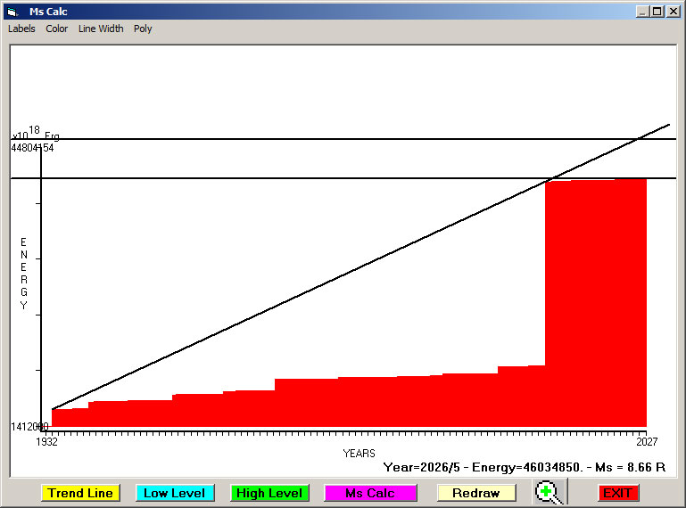 Fig. 6. Expected EQ magnitude due to application of the LSEFM (Lithospheric Seismic Energy Flow Model) on past (since 1932) seismic history of the regional seismogenic area.