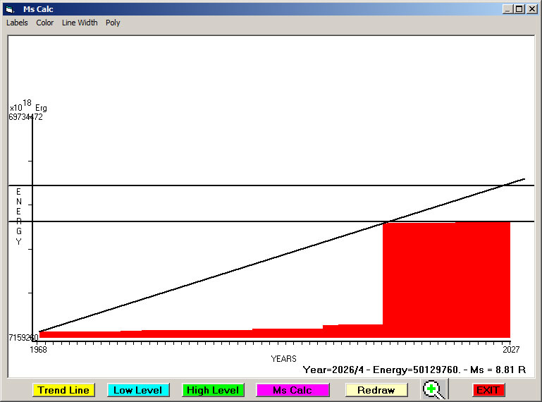 Fig. 7. Expected EQ magnitude due to application of the LSEFM (Lithospheric Seismic Energy Flow Model) on past (since 1968) seismic history of the regional seismogenic area.