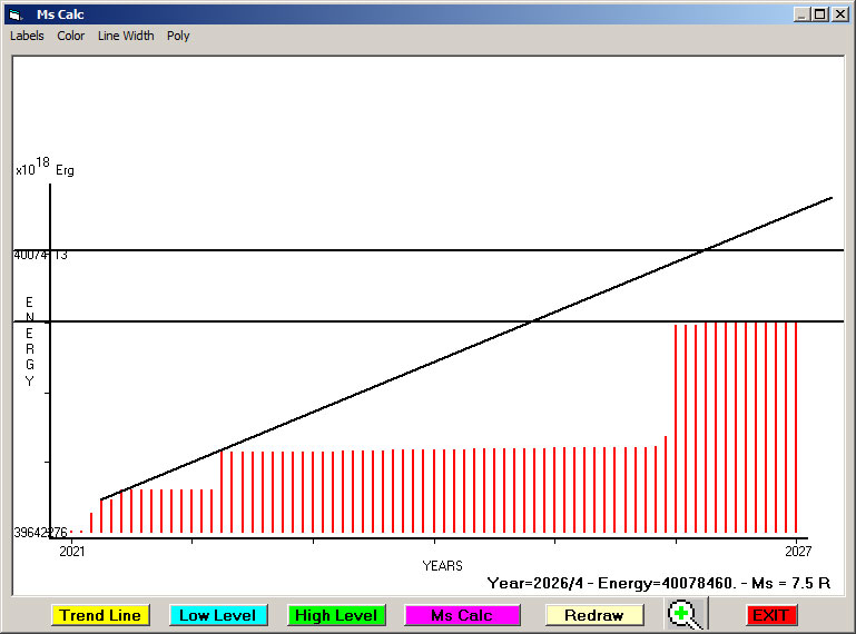 Fig. 9. Expected EQ magnitude due to application of the LSEFM (Lithospheric Seismic Energy Flow Model) on past (since 2021) seismic history of the regional seismogenic area.