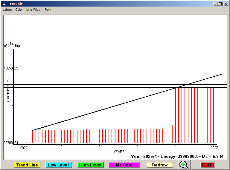 Fig. 10. Expected EQ magnitude due to application of the LSEFM (Lithospheric Seismic Energy Flow Model) on past (since 2022) seismic history of the regional seismogenic area.