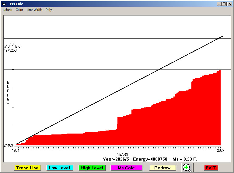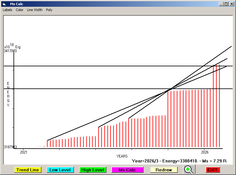 Fig. 5. Expected EQ magnitude due to application of the LSEFM (Lithospheric Seismic Energy Flow Model) on past (since 1904) seismic history of the regional seismogenic area.