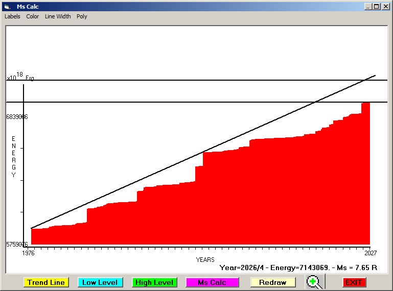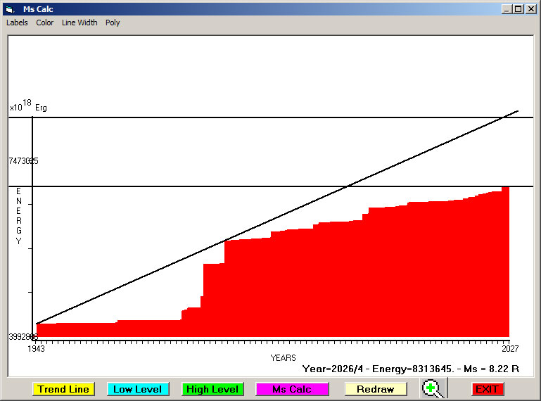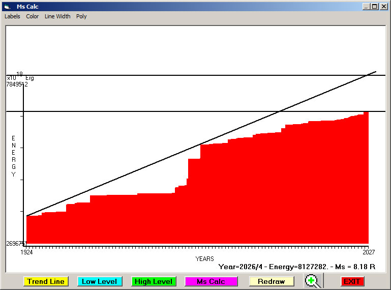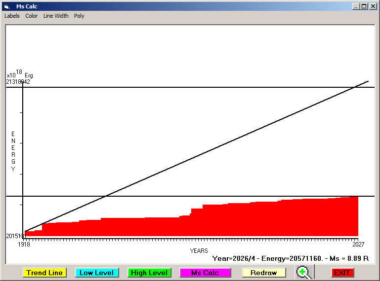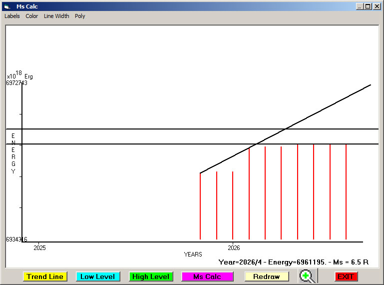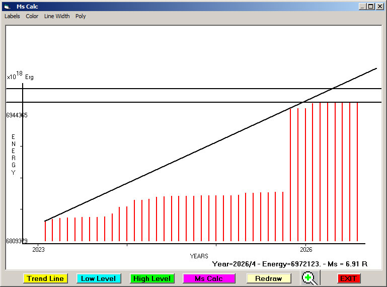 Fig. 13. Expected EQ magnitude due to application of the LSEFM (Lithospheric Seismic Energy Flow Model) on past (since 2025) seismic history of the regional seismogenic area.