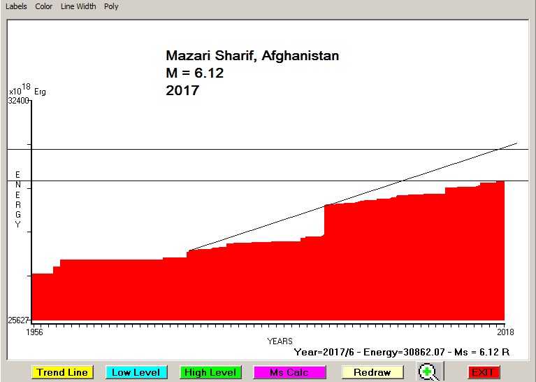 City : Mazari Sharif, Afghanistan. Geographical coordinates : Lat : 36.709 N - Lon : 67.111 E Data base used : USGS (May, 2017). Radius of regional seismogenic area : 150 Km. Accumulated seismic energy expressed in terms of EQ magnitude : M = 6.12 Fig. 1. Equivalent EQ magnitude due to application of the LSEFM (Lithospheric Seismic Energy Flow Model) on past seismic history of the regional seismogenic area.