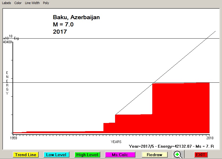 City : Baku, Azerbaijan. Geographical coordinates : Lat : 40.378 N - Lon : 49.892 E Data base used : USGS (May, 2017). Radius of regional seismogenic area : 150 Km. Accumulated seismic energy expressed in terms of EQ magnitude : M = 7.0 Fig. 1. Equivalent EQ magnitude due to application of the LSEFM (Lithospheric Seismic Energy Flow Model) on past seismic history of the regional seismogenic area.