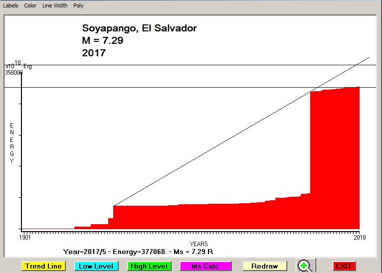 City : Soyapango, El Salvador. Geographical coordinates : Lat : 13.71 N - Lon : -89.14 W Data base used : USGS (May, 2017). Radius of regional seismogenic area : 150 Km. Accumulated seismic energy expressed in terms of EQ magnitude : M = 7.29 Fig. 1. Equivalent EQ magnitude due to application of the LSEFM (Lithospheric Seismic Energy Flow Model) on past seismic history of the regional seismogenic area.